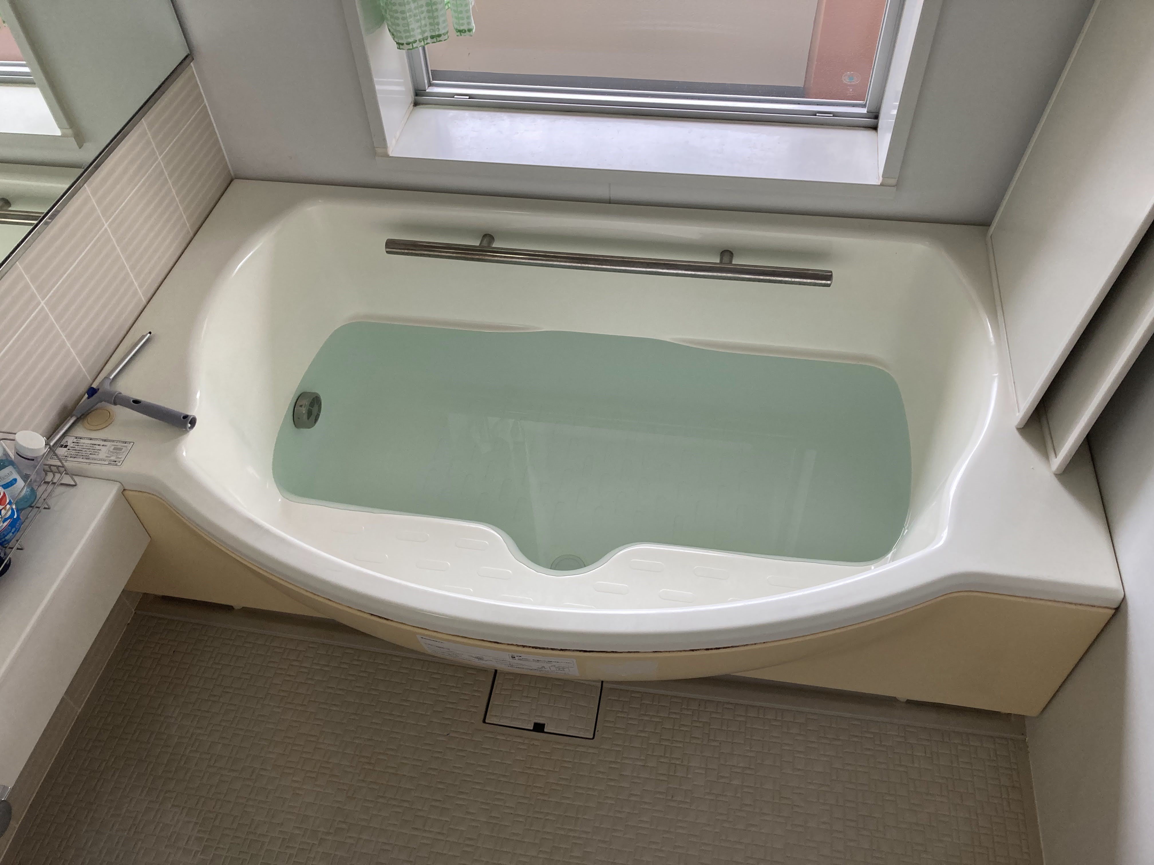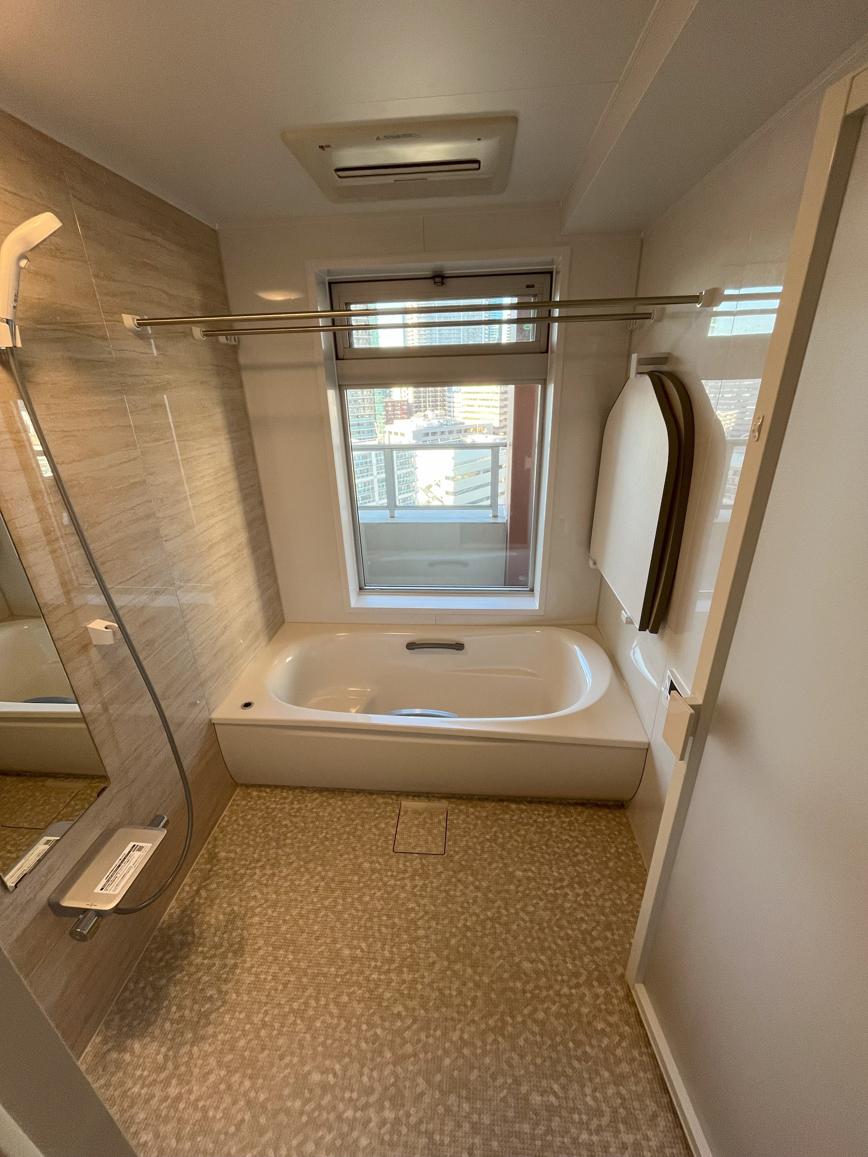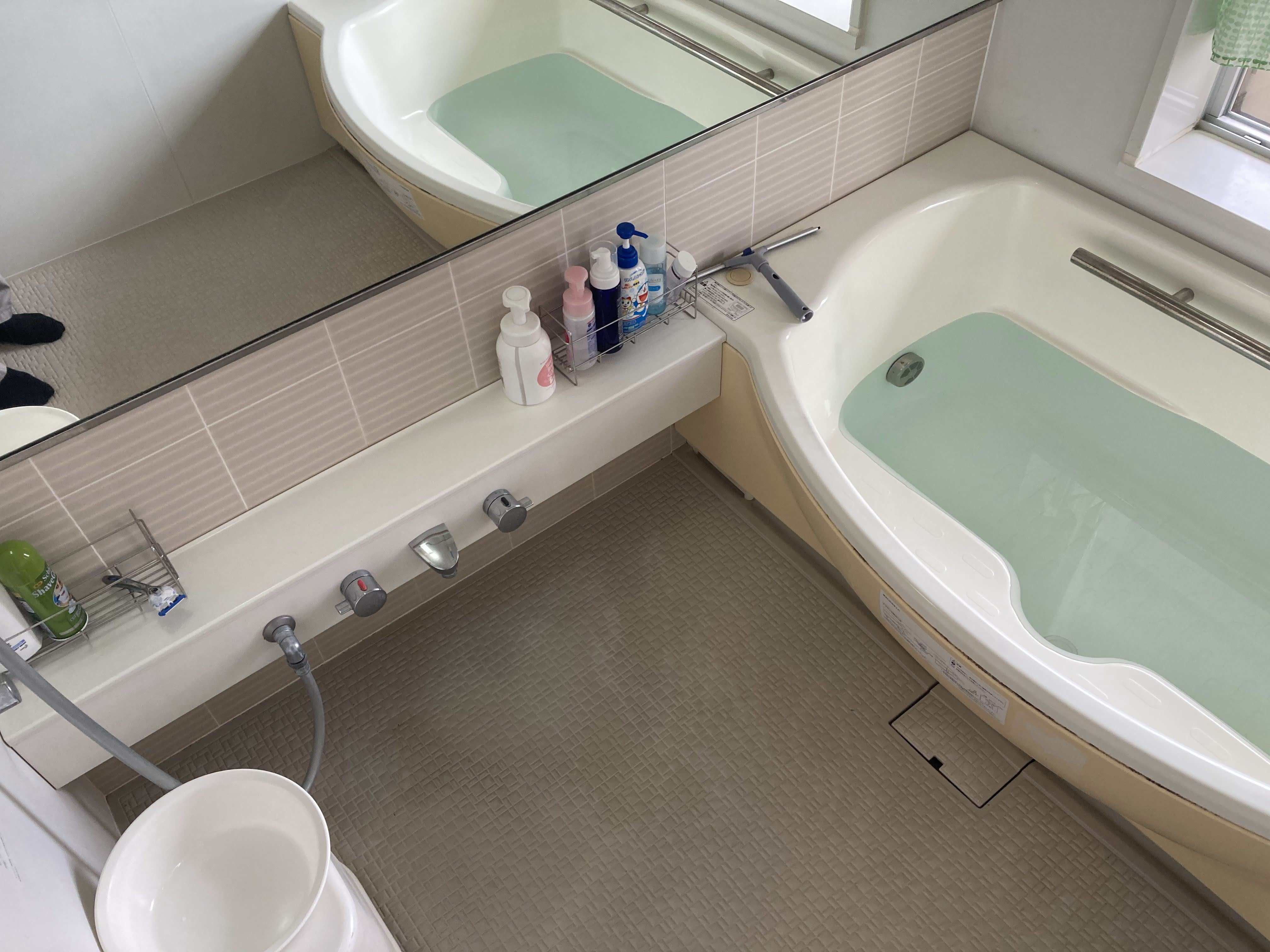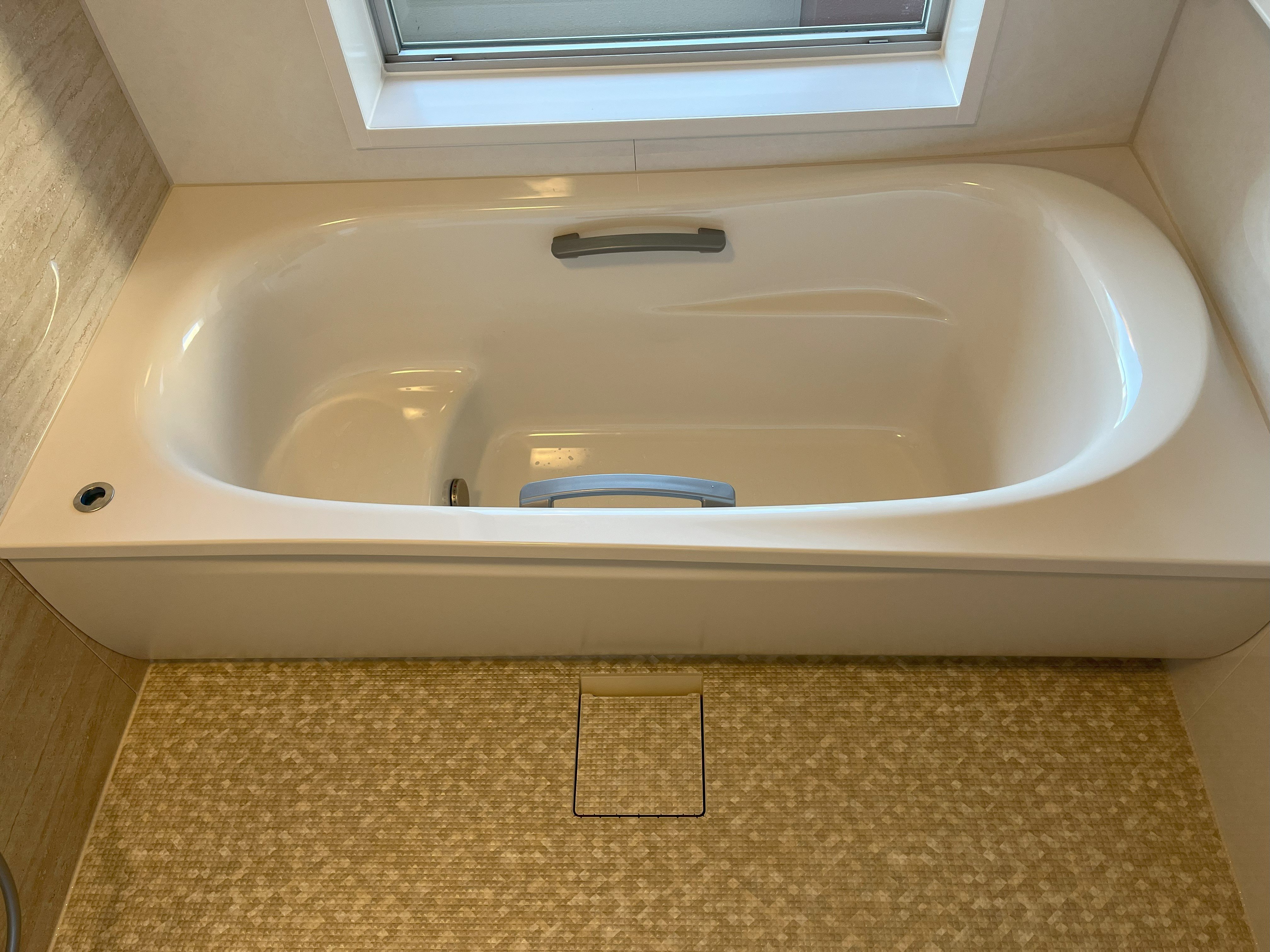 もともとは手前に広いワイド浴槽でしたが、ご夫婦ふたりでお住まいとのことで標準的サイズの浴槽へ取替え、お掃除をしやすいシンプルな仕様でご提案しました。 浴室自体も窓も大変広く、開放感のある浴室でしたが、特殊な位置に梁が出てきており、メーカーの標準仕様のままではお取替えが難しく、職人さんに造作をお願いし、広々とした洗い場の浴室空間が実現しました。