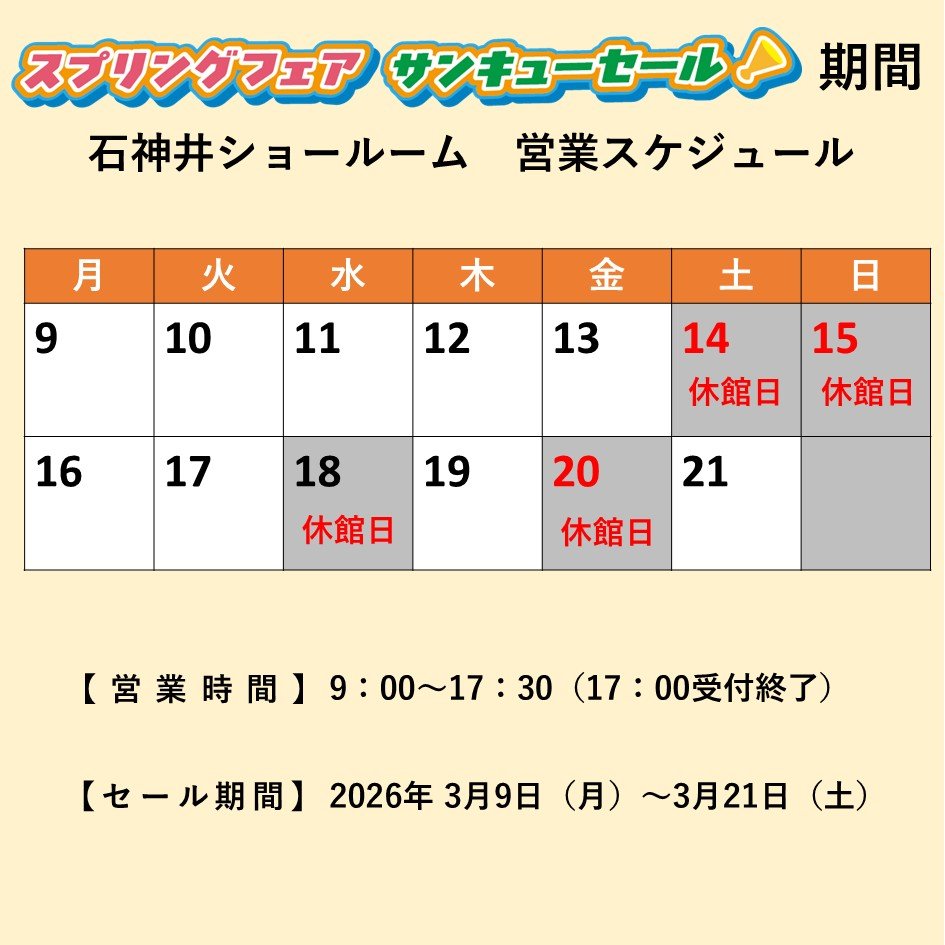 ※セール期間中でもショールームが休みの場合がございます。下記スケジュールにてお問い合わせください。